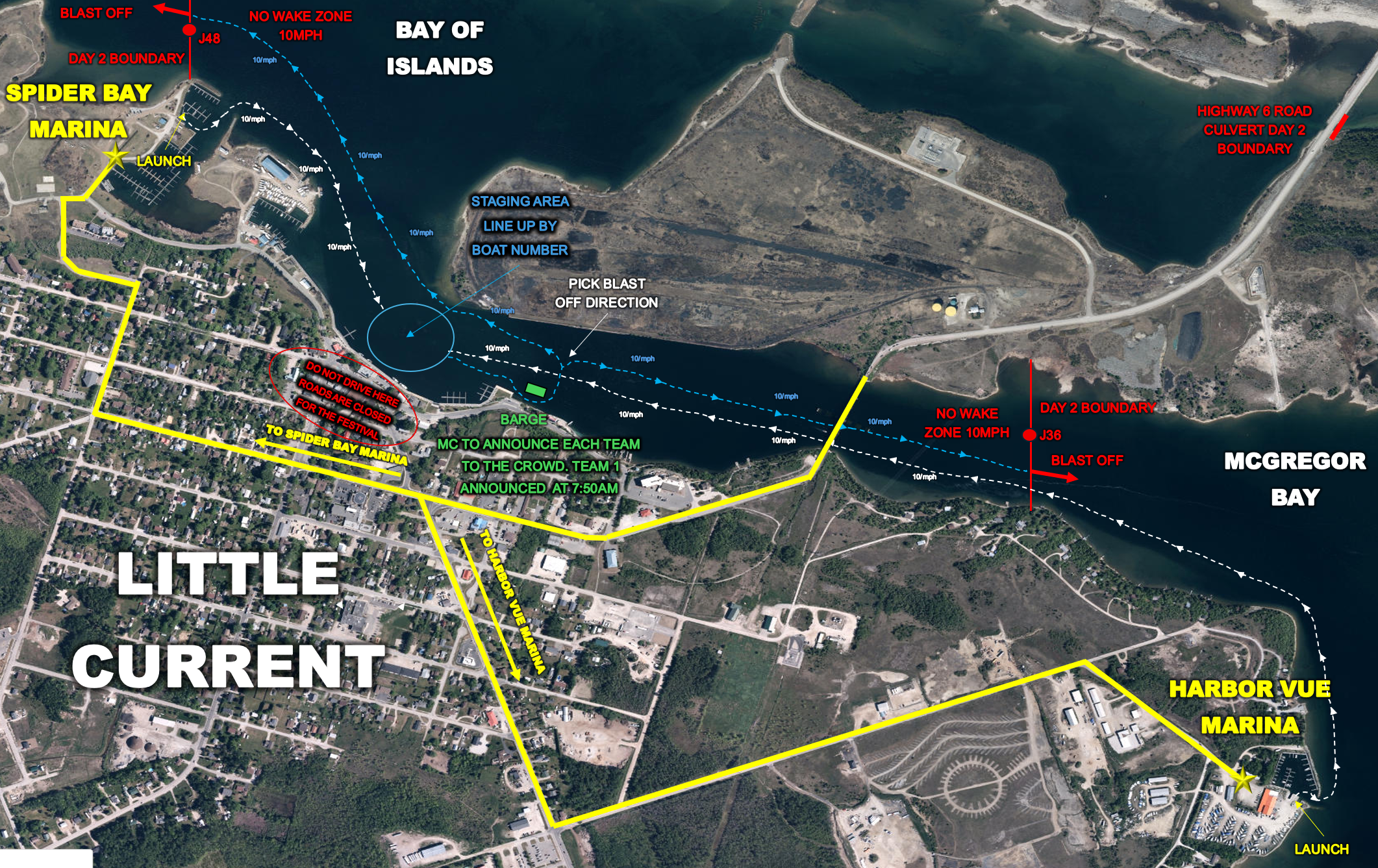 8 All teams will troll out single file at 10MPH to the selected blast off point. The blast off points will be marked with 9ft Banners that Indicate “NO WAKE 10MPH” / “DAY 2 BOUNDARY” and “BLAST OFF POINT” affixed to buoys numbers J36 & J48. No team is permitted to pass another team in the no wake zone while traveling to the blast off points (only exception is if their boat fails).